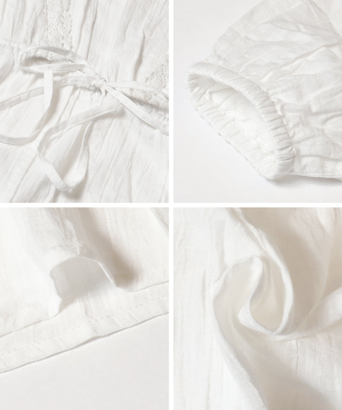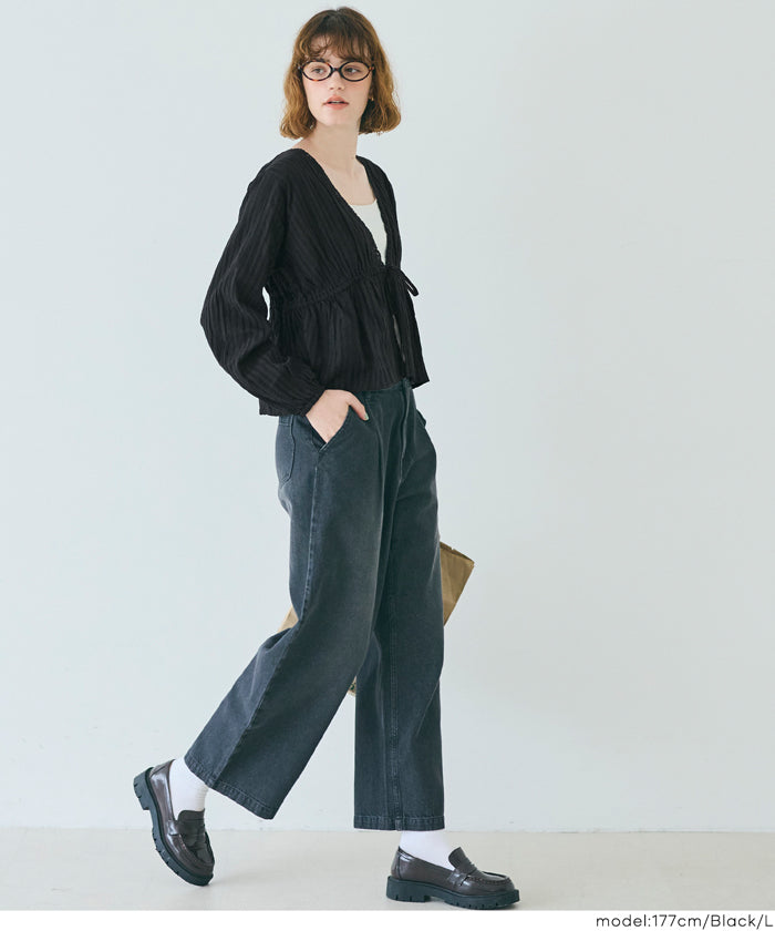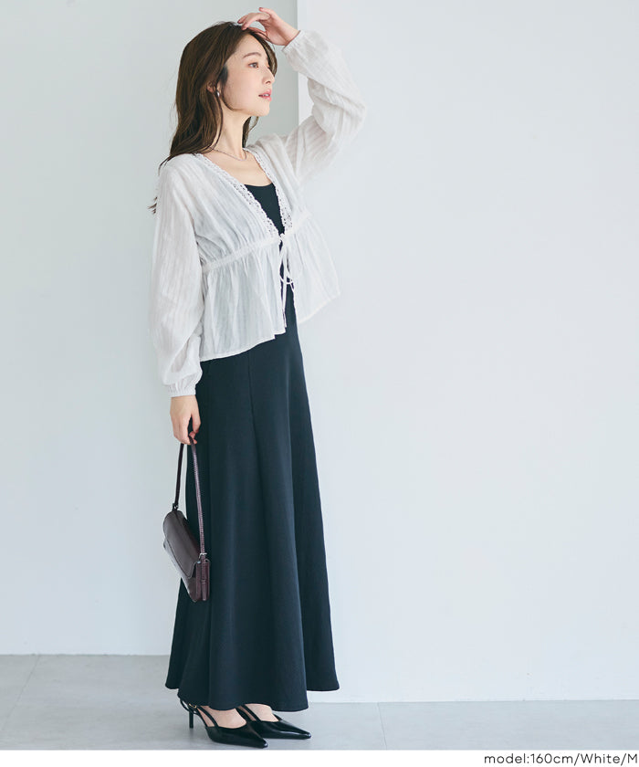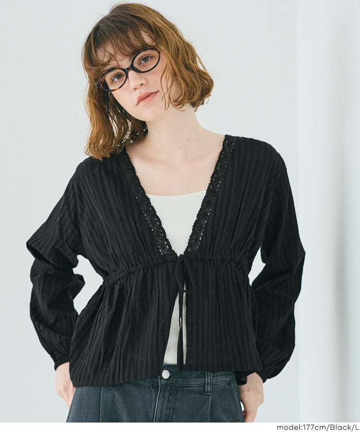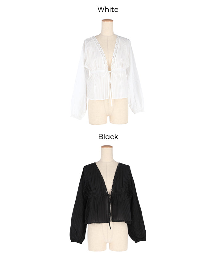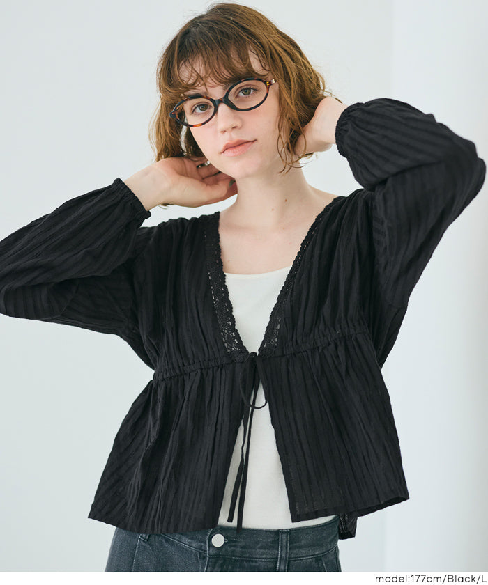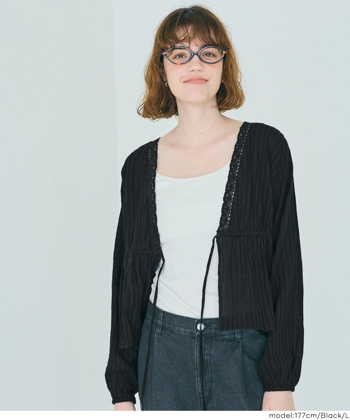 日系甜美條紋蕾絲綁帶泡泡袖開衫